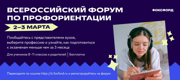 19.02.2024Информируем, что 2-3 марта 2024 года с 12:00 до 16:00 по московскому времени на платформе онлайн-школы «Фоксфорд» в формате вебинаров пройдет Всероссийский форум по профориентации.