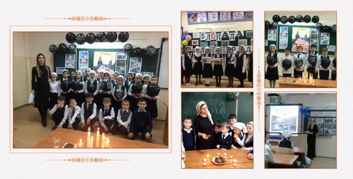 В 4в классе оформили уголок, символизирующий голод-хлеб блокадного Ленинграда, вода- вышли из строя водопроводы, свечки – отсутствие электричества, коленопреклоненные мальчики- память о всех погибших.